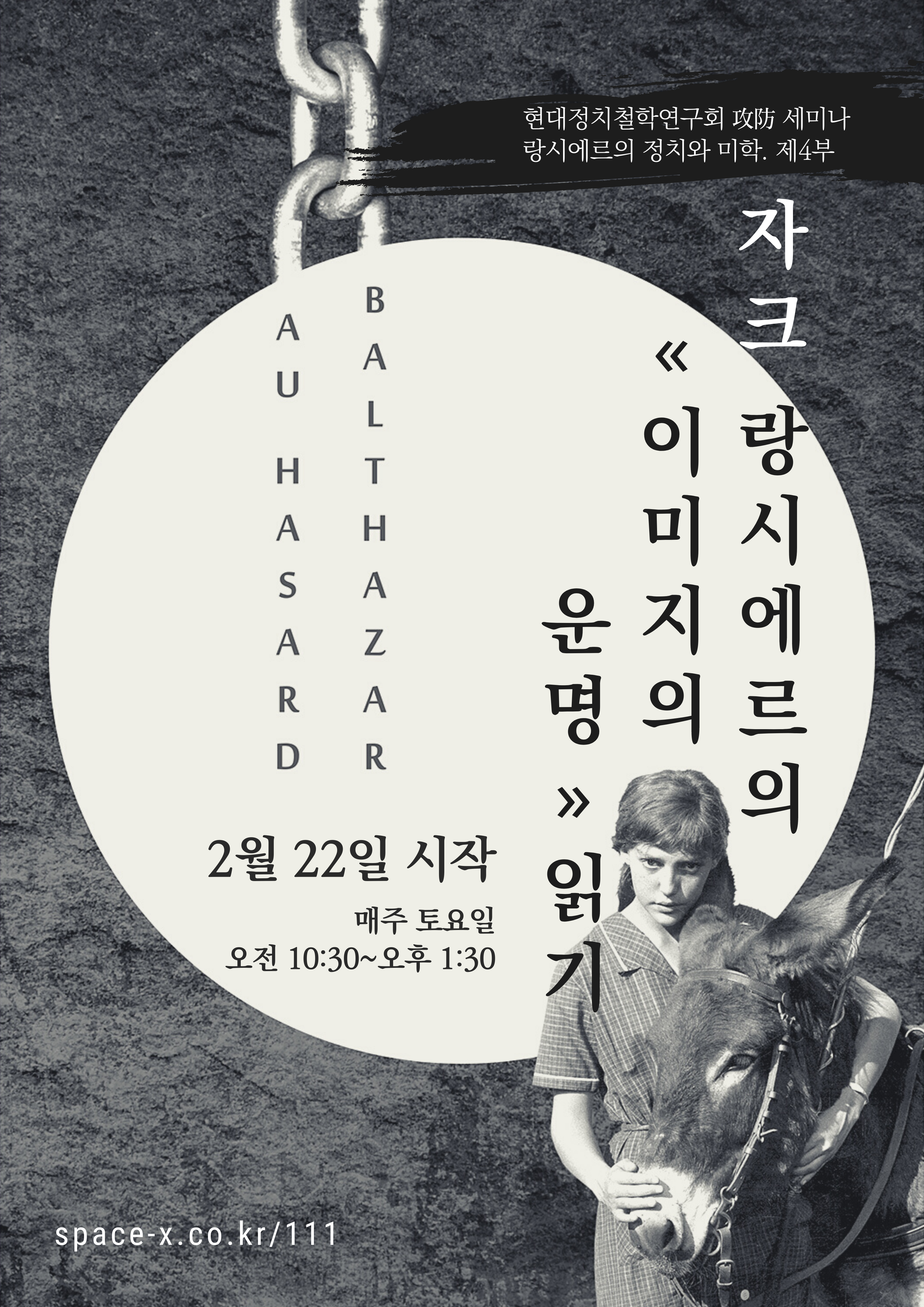현정철 공방 “랑시에르의 정치와 미학” 세미나에서는 «무지한 스승», «감각적인 것의 나눔», «미학 안의 불편함»에 이어 «이미지의 운명»을 읽습니다. 국역본을 한 줄씩 읽어나가는 강독 형식으로 진행되며, 한 주에 대략 20~30쪽을 읽습니다.