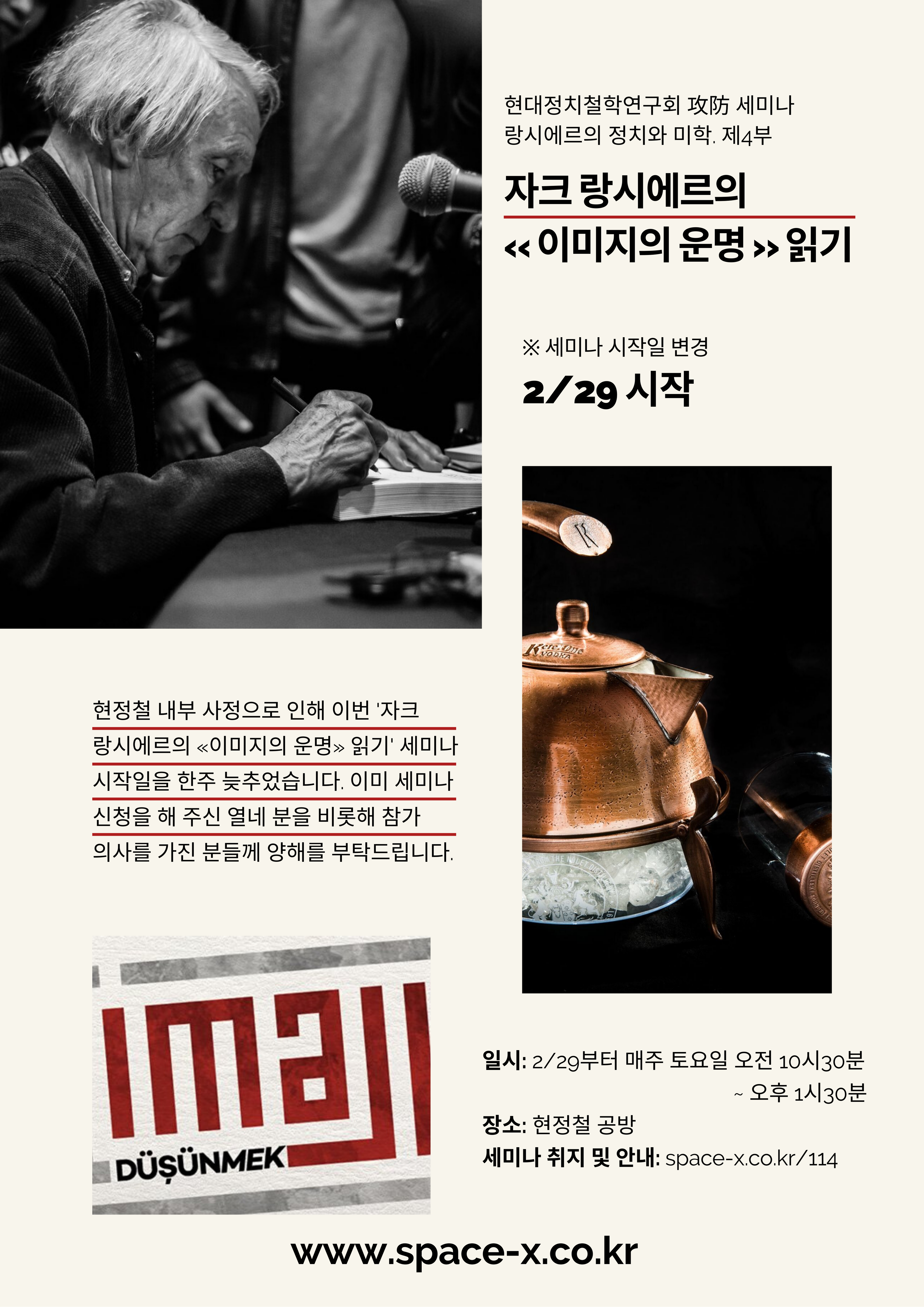 현정철 공방 “랑시에르의 정치와 미학” 세미나에서는 «무지한 스승», «감각적인 것의 나눔», «미학 안의 불편함»에 이어 «이미지의 운명»을 읽습니다. 국역본을 한 줄씩 읽어나가는 강독 형식으로 진행되며, 한 주에 대략 20~30쪽을 읽습니다.