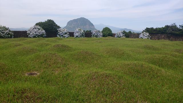 이곳은 한국전쟁과 함께 이승만정권이 집단학살한 보도연맹원 등 예비검속자들의 묘지였다. 1950년 8월 20일 경찰과 군은 예비검속대상자 250명을 송악산 섯알오름에 끌고 가 집단학살했다. 유가족들은 시체도 수습하지 못하고 눈물로 지내다가 6년 뒤 149구의 시체를 몰래 발굴했지만 132구는 신원을 확인할 수 없었다, 그래서 ‘백 명의 할아버지의 한 자손’이라는 특이한 이름을 붙여 함께 묻은 것이다. 아름다운 산방산을 배경으로 이어져 있는 묘의 봉우리들을 보자 나도 모르게 눈물이 났다.