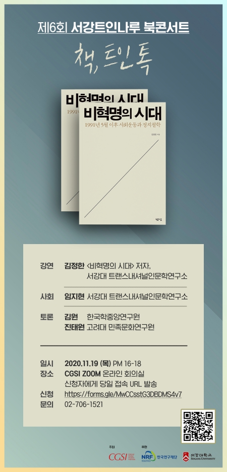 서강대학교 트랜스내셔널인문학연구소 산하 지역인문학센터 ‘서강트인나루’에서 <비혁명의 시대: 1991년 5월 이후 사회운동과 정치철학>의 저자 김정한 선생님을 모시고 2020년 11월 19일(목) 오후 4시, 여섯 번째 북토크 <책, 트인 톡>을 진행합니다.