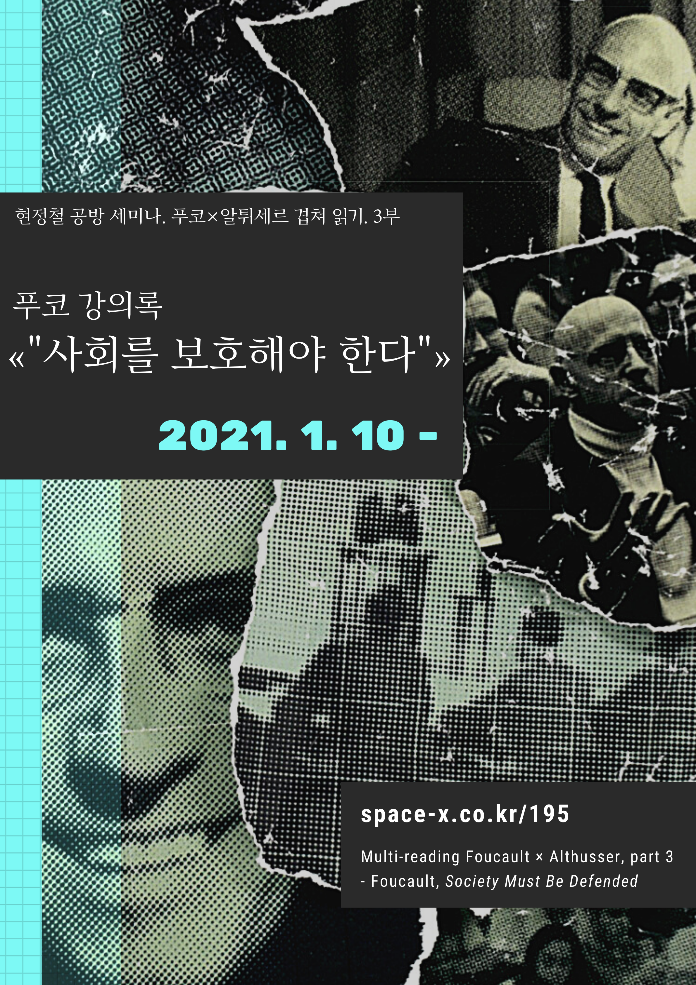저희 세미나 모임은 그 동안 푸코의 «감시와 처벌», 알튀세르의 «재생산에 대하여», 발리바르의 <마르크스주의에서 이데올로기의 동요>, «마르크스의 철학»을 함께 읽어 왔습니다. 앞으로 두 달여간 푸코의 1976년 콜레주드프랑스 강의록 «“사회를 보호해야 한다”»를 읽고자 합니다.