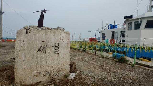 새벽 팽목항은 아직도 밝혀지지 않은 세월호의 진실처럼 물안개 속에 잠겨 있었다. 물안개가 걷히기를 기다리며 텅 빈 부둣가에 앉아 있자 바다에서 어린 학생들의 울음소리가 들리는 것 같아 나도 모르게 눈물이 흘렀다. 안개가 걷히자 세월호 현장의 상징이 된, 노란 띠를 두른 빨간 등대가 눈에 들어오고 임시분향소로부터 기념관 등이 모습을 드러냈다. 특히 가슴을 뭉클하게 한 것은 위에 녹슨 쇳조각이 달린 부서진 회색 콘크리트 덩어리에 검은 페인트로 쓴 ‘세월’이라는 글씨였다. ‘세월호’를 의미하는 것으로 보이지만 내게는 지나가는 ‘세월’로 읽혔다. 비극적인 사건도 이제 6년이 지나 7년을 향해 가고 있다.