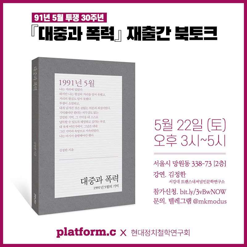 □ 플랫폼c에서는 매월 사회운동 이슈를 주제로 삼는 월례포럼을 개최합니다. 이번에는 현대정치철학연구회와 함께 1991년 5월 투쟁 30주년 <대중과 폭력 - 1991년 5월의 기억> 재출간 북토크를 열어 저자 김정한 서강대 트랜스내셔널인문학연구소 연구교수와 함께 이야기를 나누고자 합니다.