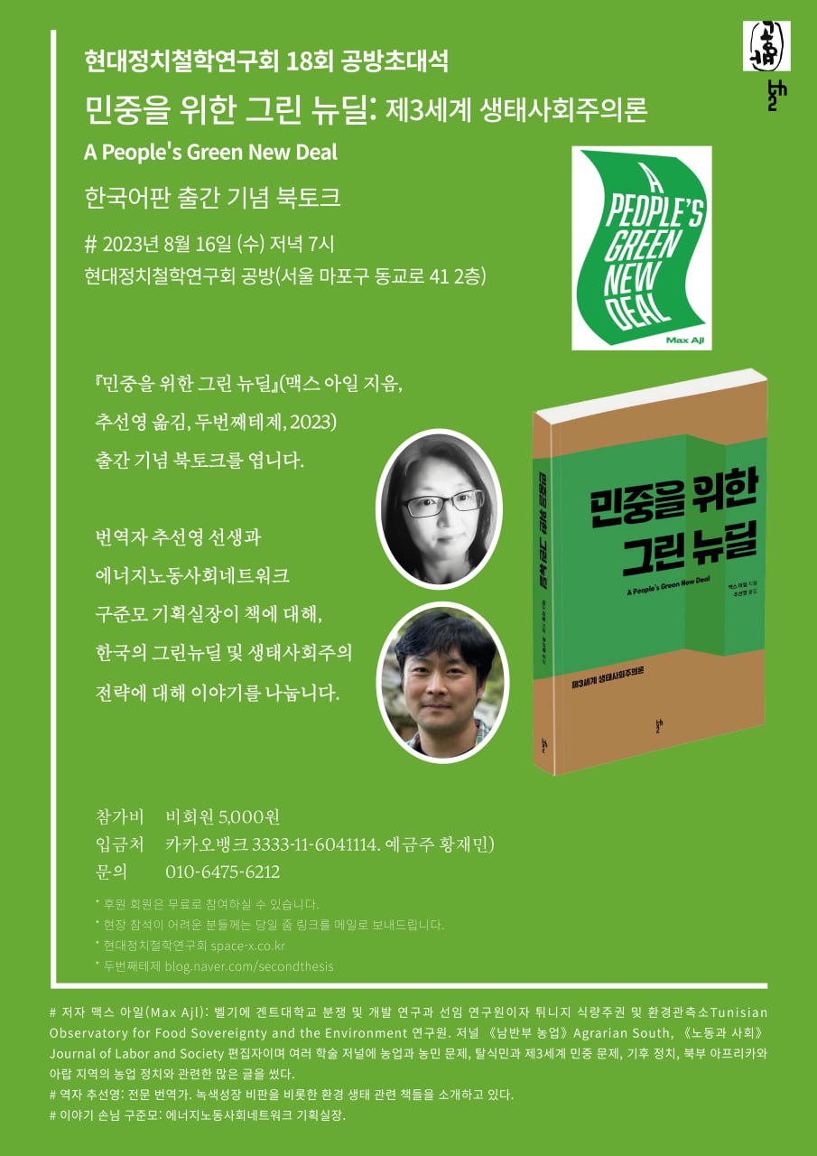 민중을 위한 그린 뉴딜 : 제 3세계 생태사회주의론 (맥스 아일 지음, 추선영 옮김, 두번째테제, 2023) 출간 기념 북토크를 엽니다.