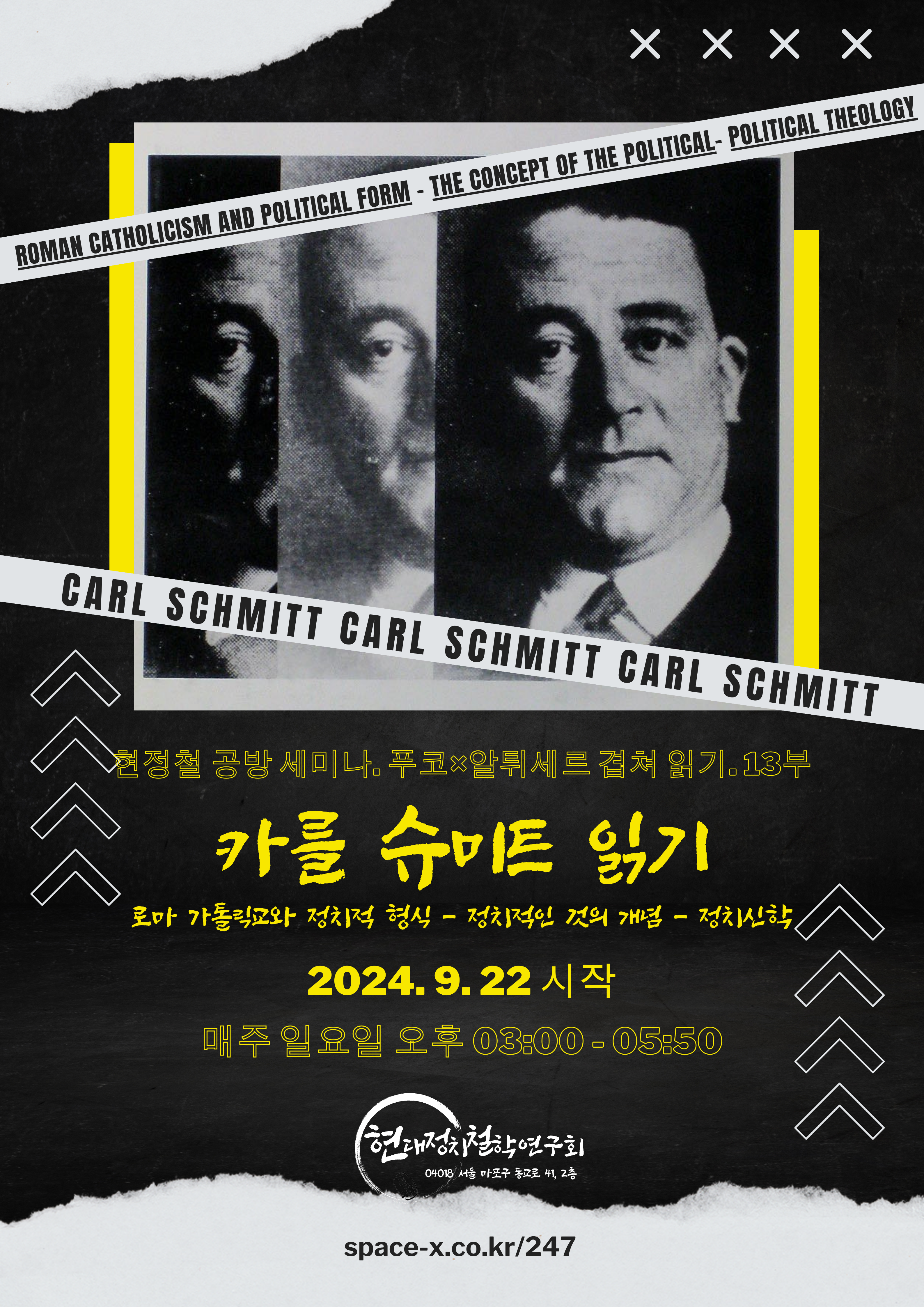 ※ 이 세미나는 카를 슈미트의 « 로마 가톨릭교와 정치적 형식 » (윤인로 옮김, 두번째테제, 2024)을 시작으로 슈미트의 주요 저작들을 함께 읽는 자리입니다. 온라인으로 진행합니다.