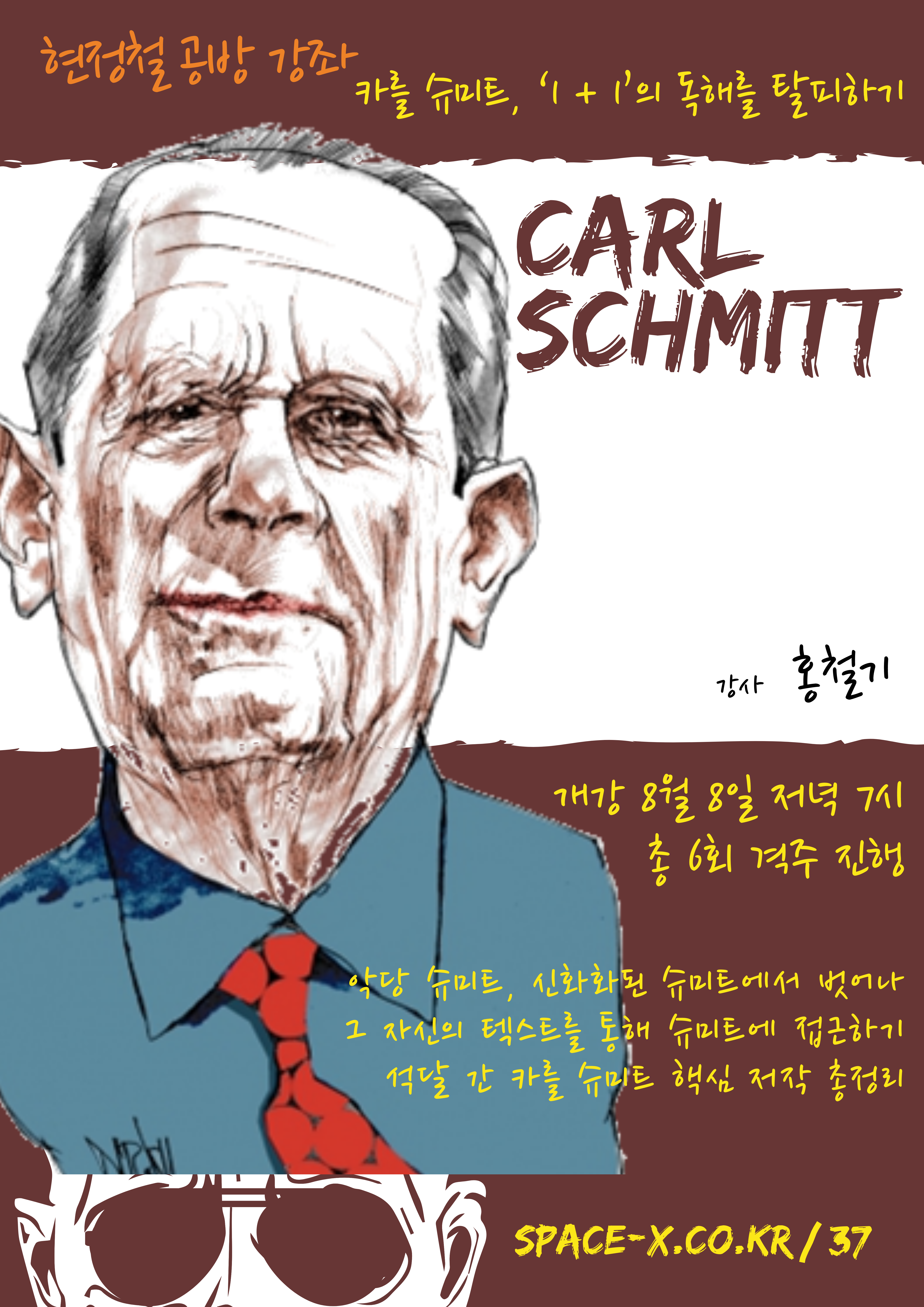 본 강좌는 이른바 ‘1+1’의 독해를 탈피해서 카를 슈미트를 읽는 데 목표를 둔다. ‘1+1’ 독해란 슈미트의 텍스트를 그 자체로, 혹은 당대의 상황과 논쟁에 처한 인물의 저술로 읽는 것이 아니라, 현대의 해석자 혹은 비판자의 대화상대로 혹은 그가 인용하는 인물로 슈미트를 소비하는 방식의 독해를 말한다. 그러한 독해에서 슈미트는 현대의 해석자/비판자가 결국에는 자기 글 안에서 승리를 거두는 데 필요한 악당과 같은 인물의 역할만을 부여받는다. 하지만 동시에 악당으로서의 슈미트는 이러한 해석자들과 비판자들에 의해서 오히려 신화화된다. 그리고 이러한 신화화야말로 슈미트 자신의 의도에 부합한다. 본 강좌에서 시도하는 것은 바로 이러한 ‘신화화’의 반대방향에서 접근하는 독해다.