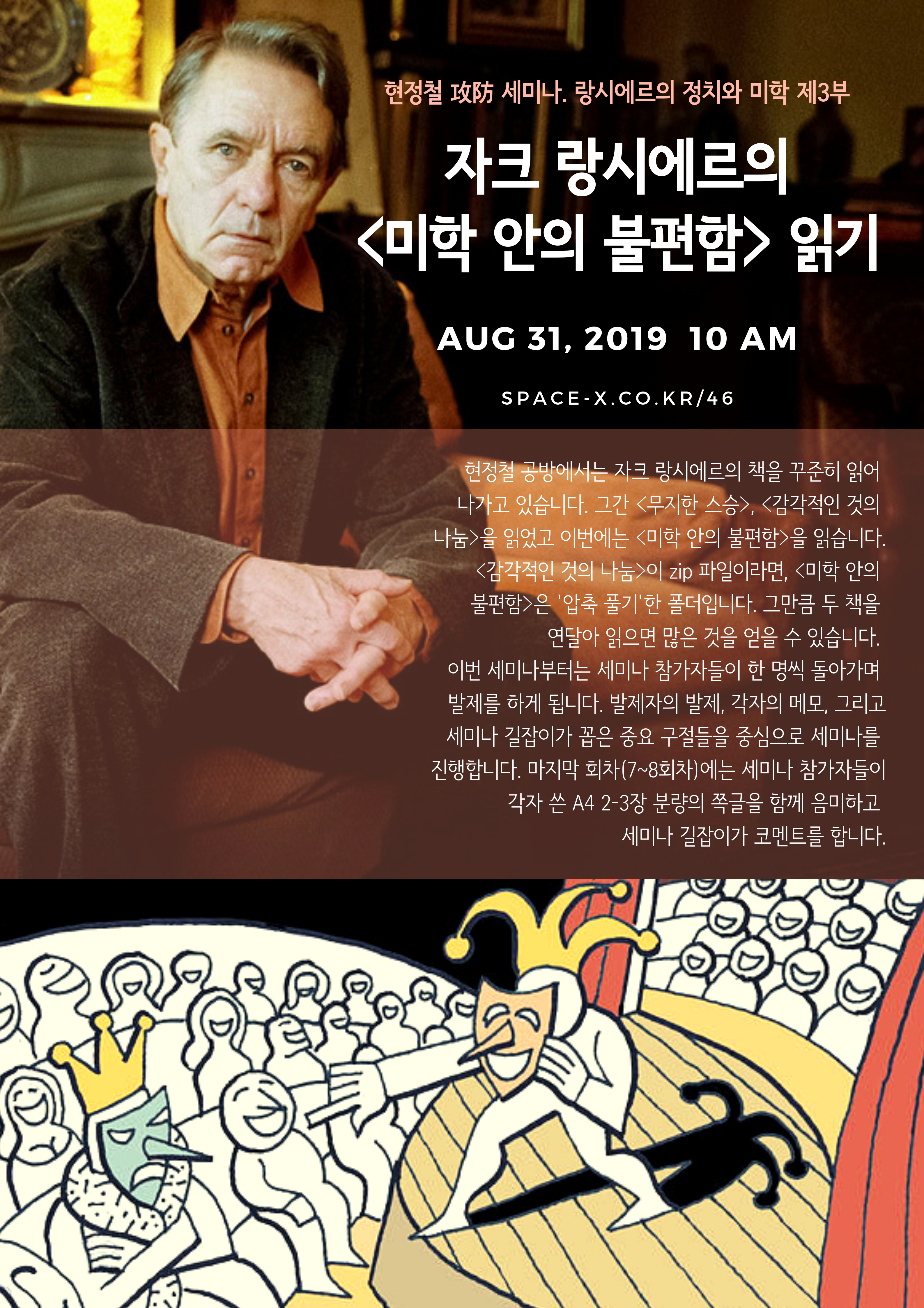 현정철 공방에서는 자크 랑시에르의 책을 꾸준히 읽어나가고 있습니다. 그간 <무지한 스승>, <감각적인 것의 나눔>을 읽었고 이번에는 <미학 안의 불편함>을 읽습니다. <감각적인 것의 나눔>이 zip 파일이라면, <미학 안의 불편함>은 '압축 풀기'한 폴더입니다. 그만큼 두 책을 연달아 읽으면 많은 것을 얻을 수 있습니다. 이번 세미나부터는 세미나 참가자들이 한 명씩 돌아가며 발제를 하게 됩니다. 발제자의 발제, 각자의 메모, 그리고 세미나 길잡이가 꼽은 중요 구절들을 중심으로 세미나를 진행합니다. 마지막 회차(7~8회차)에는 세미나 참가자들이 각자 쓴 A4 2-3장 분량의 쪽글을 함께 음미하고 세미나 길잡이가 코멘트를 합니다.