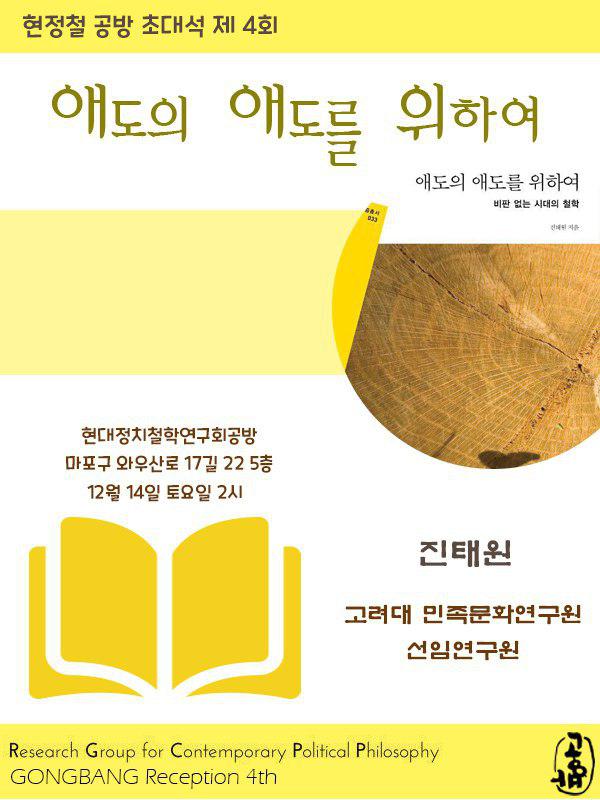 진태원 선생님의 새로운 저서, 『애도의 애도를 위하여』를 중심으로 진태원 선생님이 생각하는 비판없는 시대의 철학이 무엇인지, 포스트 담론과 좌파 메시아주의, 민족 공동체 및 마르크스 주의의 탈구축 속에서 '우리 자신을 어떻게 애도할 것인지'를 들어보는 자리를 마련했습니다. 한국 사회의 지적풍경을 지배했던 포스트 담론에 대한 애도, 그리고 그 속에서 타자와 우리에 대한 애도가 어떻게 가능한지를 들어볼 수 있을 소중한 자리가 될 것이라 기대합니다.